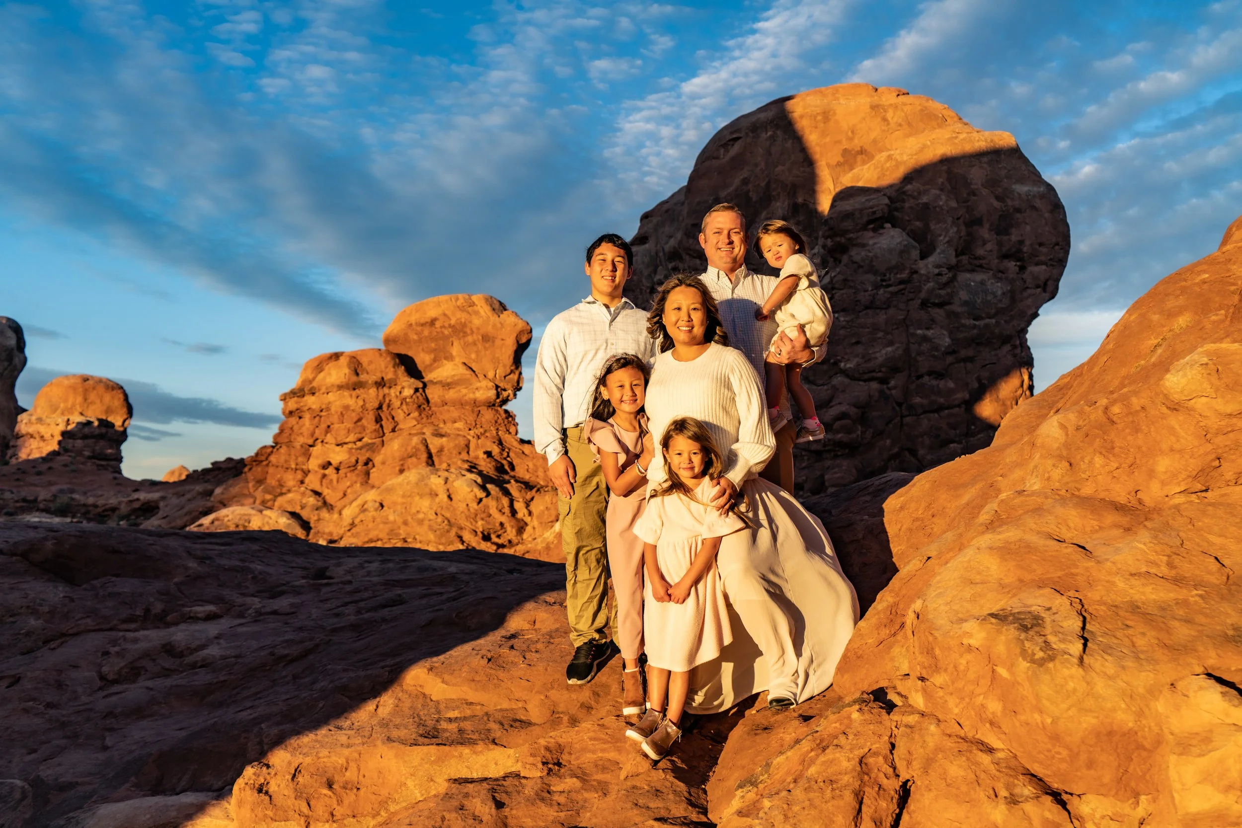 Rachel and Jason celebrating at Looking Glass Arch Moab Utah. We climbed to the summit danced around giggling took in the views had a wardrobe change for the rappel of the arch, and popped champagne at sunset.